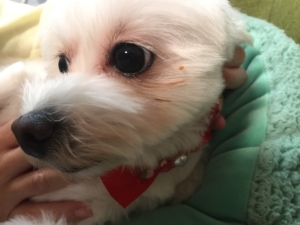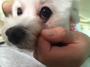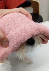 こうした場合は目周り、特に鼻先から目の下にかけての被毛を定期的に短くすることをお勧めしますが、飼い主様が自宅で切るのは非常に困難だと思います。